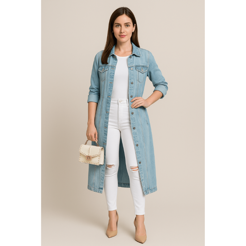 Crafted from light denim fabric, this coat is comfortable and breathable, ideal for transitional seasons. The structured shoulders and classic lapel collar provide a stylish shape, while the full length ensures a flattering, flowing silhouette.