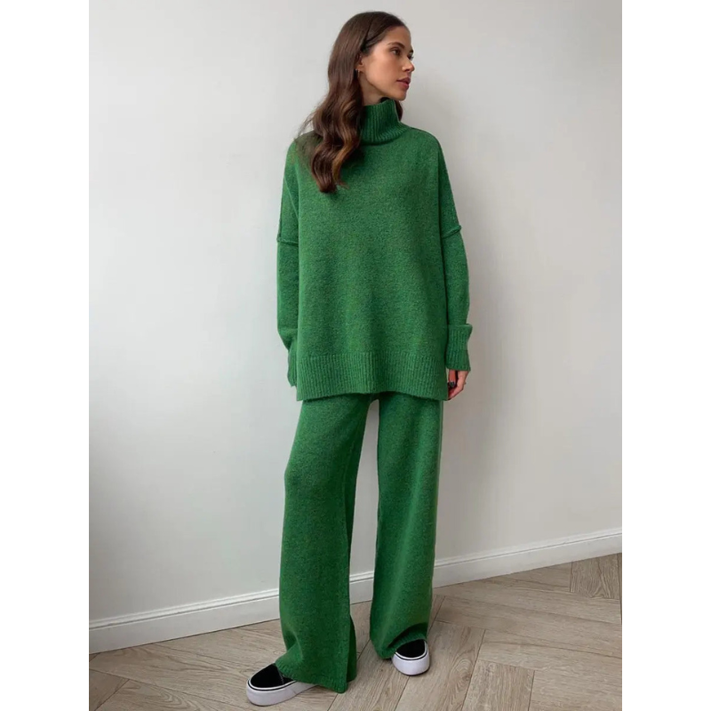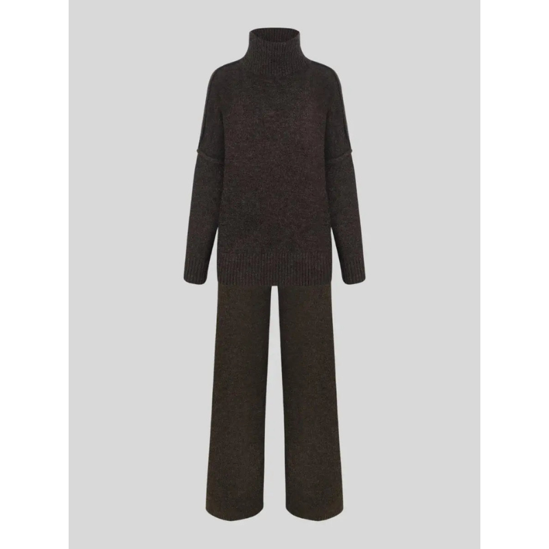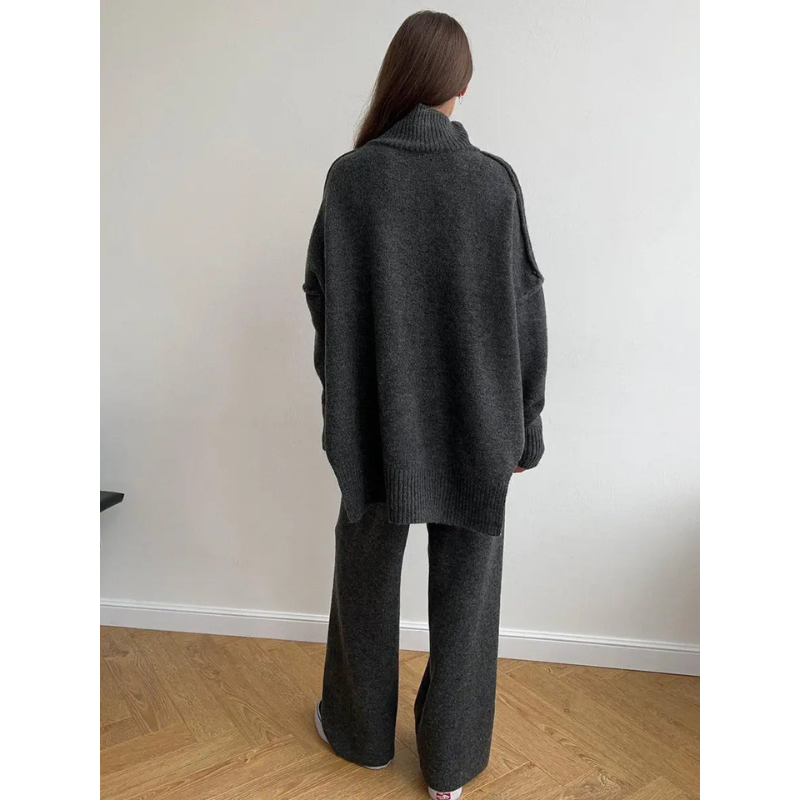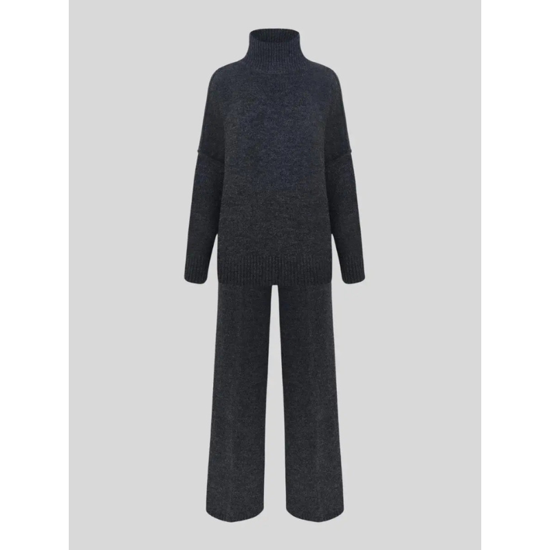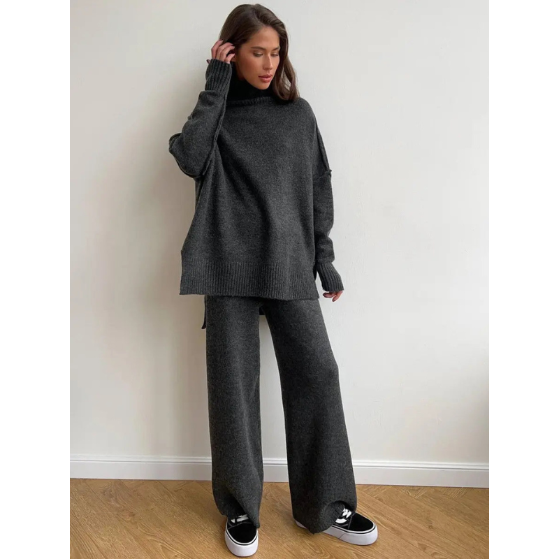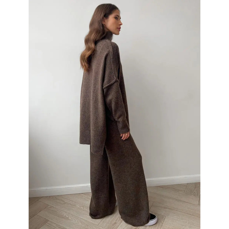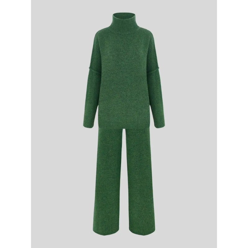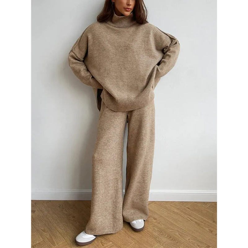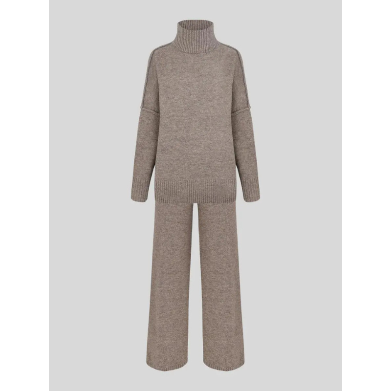 This stylish two-piece ensemble features a soft knit sweater with a high, enveloping collar and relaxed-fit pants with elegant wide legs. Crafted from a fabric that feels luxuriously soft against the skin, this set is perfect for cool days, whether at home or on the go.