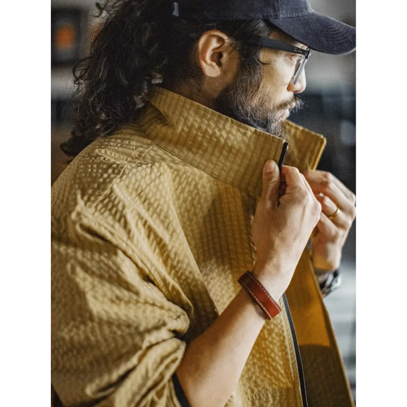 This men's jacket seamlessly blends a modern aesthetic with subtle luxury. Featuring a high collar and full zipper closure, it offers both comfort and functionality. The woven checked texture adds a distinctive touch, making it a stylish choice for any occasion.