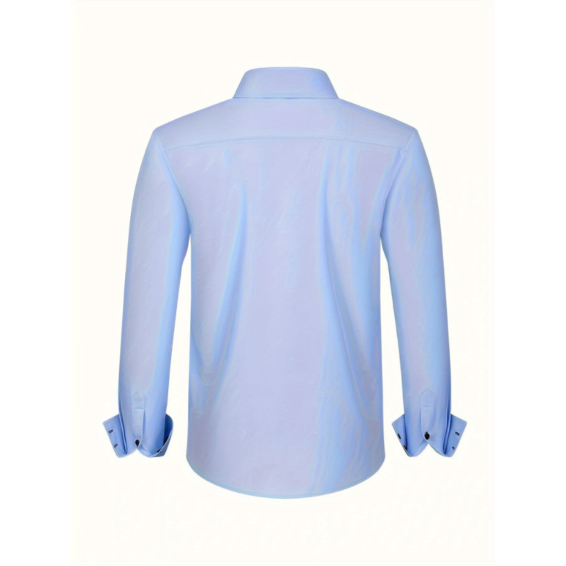 This men's shirt in light blue combines refined elegance with modern comfort. The double-breasted design and classic contrast cuffs create a luxurious appearance, making it perfect for formal occasions in spring and beyond.